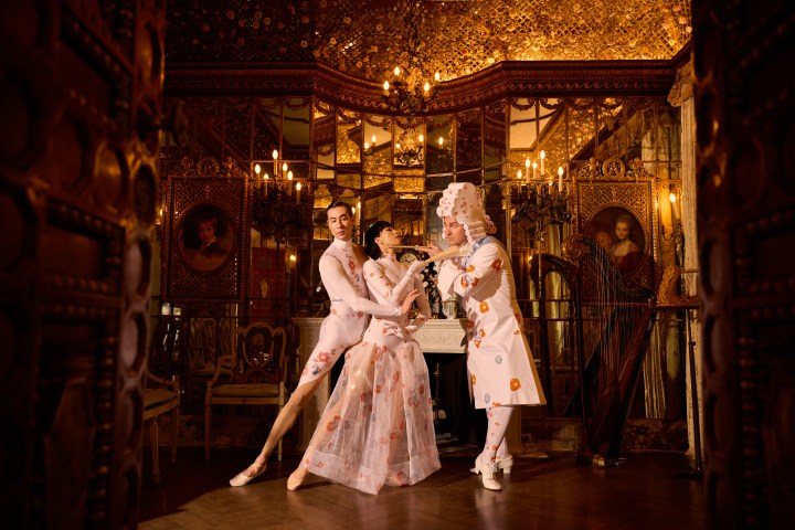 The Ballet des Porcelaines cast in the Venetian Room, Albertine Headquarters, Cultural Services of the French Embassy, NYC. From left to right: Daniel Applebaum (Prince); Georgina Pazcoguin (Princess); Tyler Hanes (Sorcerer). Photo by Joe Carrotta.
