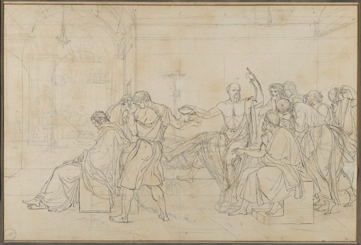Jacques Louis David, The Death of Socrates, ca. 1786, pen and black ink, over black chalk, touches of brown ink, squared in black chalk, sheet: 11 × 16 inches (New York: The Metropolitan Museum of Art, 2015.149).