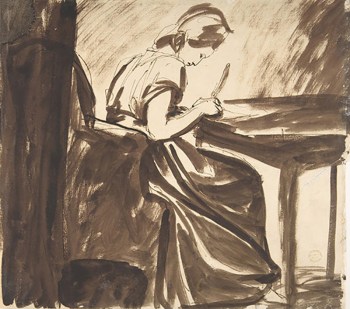 George Romney, Lady Seated at a Table (recto); pen and brown ink, brush and brown wash (NY: The Metropolitan Museum of Art, 11.66.3).