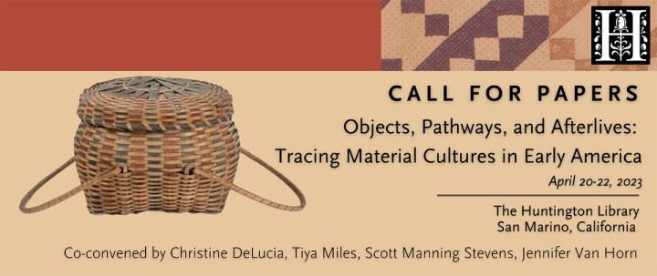 This two-and-a-half-day symposium in April 2023 at the Huntington Library will articulate new pathways forward in American material cultures, broadly defined in terms of subject matter, hemispheric geography, and time period (from roughly 1500 to 1860). We invite holistic thinking about existing fault lines in object study and the generative spaces around issues of power, absence, representation, labor, hybridity, and materiality. Recognizing that ‘early’ America itself has been contested in productive ways, we ask what work ‘early’ American objects can help effect along the lines of contemporary visual sovereignty as well as cultural preservation and knowledge production.