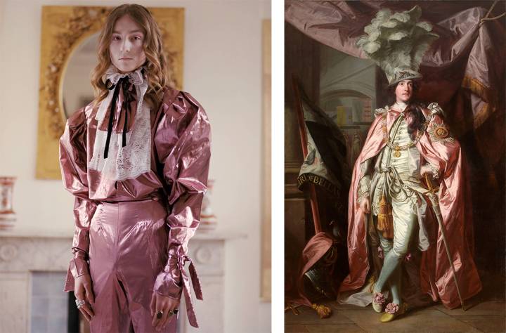 Left: Harris Reed Fluid Romanticism 001 (Courtesy Harris Reed; photo by Giovanni Corabi). Right: Joshua Reynolds, Portrait of Charles Coote, 1st Earl of Bellamont (1738–1800), in Robes of the Order of the Bath, 1773–74 (Dublin: National Gallery of Ireland).