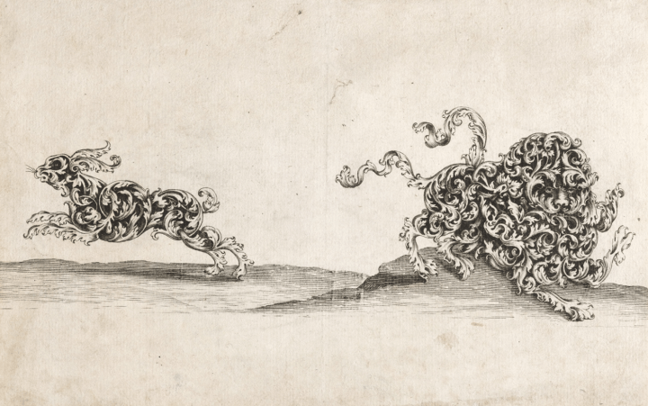 Wolfgang Hieronymus Von Bömmel, Lion and Hare Composed of Ornamental Leaf-Work, from Neueersonnene Gold-Schmieds Grillen (New Designs for Ornaments in Gold), 1698, engraving on off-white laid paper, 12.7 × 20 cm (Cooper Hewitt, Smithsonian Design Museum, Smithsonian Institution, museum purchase through gift of the Estate of David Wolfe Bishop).