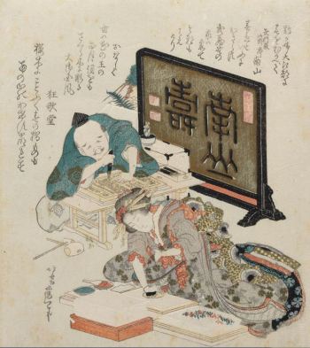 Katsushika Hokusai, Block-cutting and printing surimono, 1825, color print from woodblocks, with metallic pigment and blind embossing, 213 x 191 mm (Cambridge: Fitzwilliam Museum, P.438-1937).