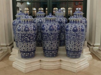 Seven of the Dragoon Vases on display in the Zwinger Palace, Dresden (Porzellansammlung, Staatliche Kunstsammlungen Dresden. Inv. Nos. PO1014/PO2064 (lid), PO1010, PO1011, PO1017, PO9130, PO9172, PO9448/ PO1013 (lid); photograph by Feng Schöneweiß, 2016).