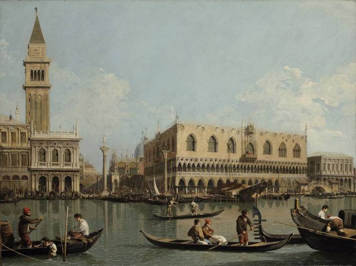 Bathed in late afternoon light, Canaletto’s composition looks eastward, down the Grand Canal, past the stately church of Santa Maria della Salute and the customs house on the Punta della Dogana. Sailboats and gondolas dot the placid water, and Venetians of various social classes mingle in the foreground. On the horizon, the bell towers of San Giorgio dei Greci, the Piazza San Marco, and San Pietro di Castelo float like buoys, while half the canvas is given over to a radiant sky, its clouds tinted pink by the approaching sunset.