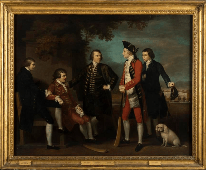 Benjamin West, The Cricketers, 1763, oil on canvas, 99 × 125 cm. The sitters are traditionally identified as the brothers Andrew and James Allen, of Pennsylvania; Ralph Wormeley, of Virginia; and Ralph Izard and Arthur Middleton, of South Carolina. Provenance: By descent in the family of Andrew Allen, acquired in 2021 by the current owner. Two versions of the painting exist, the first of which (this one) was the centerpiece of the 2018 exhibition Loyalties in Revolutionary Times at Freeman’s auction house in Philadelphia. A 25-page guide by Roland Arkell accompanied the show. The second version, dated 1764, is reproduced in Maurie Dee McInnis, ed., In Pursuit of Refinement: Charlestonians Abroad, 1740–1860 (Columbia: University of South Carolina Press, 1999), pp. 100–103.