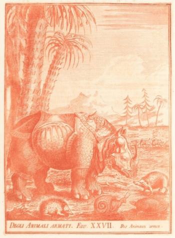 Fossati’s etchings depicting the fables of Aesop and Jean de La Fontaine targeted an international audience with text written in Italian as well as French—the cosmopolitan language of the 18th century. Some of Fossati’s images reference earlier printed works, including Albrecht Dürer’s woodcut The Rhinoceros (1515).