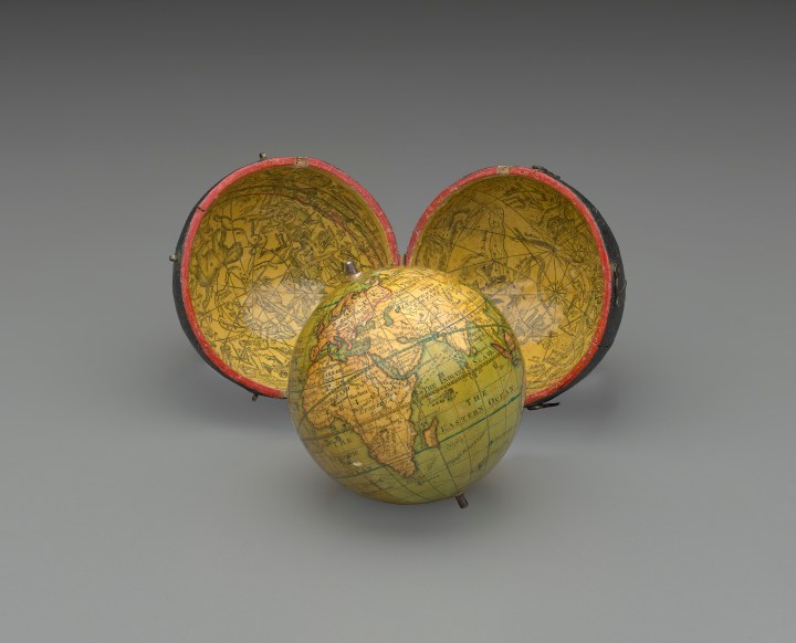 Pocket Globe with a Case (signed: “LANE’s Improved GLOBE | London”), England, ca. 1783–1803, hand-colored gores and steel; case: shagreen and brass (The Lentz Collection, on loan to the Yale Peabody Museum).