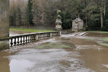 In the early 18th century, John Aislabie began transforming his nearby landscape garden of Studley Royal into a picturesque design that incorporated the entire wooded valley and featured a huge water garden with lakes, grottos, canals, and cascades. Paths were created with viewpoints that centered on classical statues and follies. In 1767, his son William bought the neighboring Abbey ruins to incorporate them into the landscape and to create the ultimate vista or ‘Surprise View.’ Centuries later, the garden design is much the same, but this important landscape is often flooded from the River Skell. To save the site, the National Trust has partnered with conservation organizations, local farmers, and landowners to implement a natural flood management program.