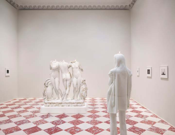 Urs Fischer, Divine Interventions, 2023, wax, based on the Metropolitan Museum of Art’s Roman sculpture The Three Graces (second century CE), with a wax portrait in the foreground of Pauline Karpidas, the contemporary art patron who once owned the ancient work. Installation view of a gallery at LGDR, 2023.