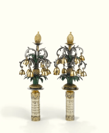 Torah finials, England, probably London, 1804, dedicated in 1834/35 (Hebrew inscription date), silver parcel gilt, and enamel, 6 inches (Collection of Jane and Stuart Weitzman). Formerly in the Reuben and Flora Sassoon Collections.