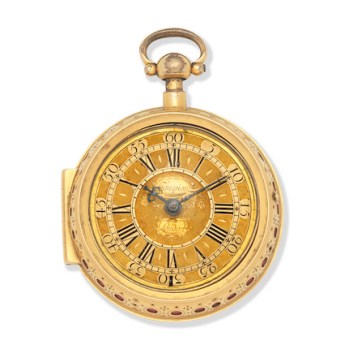 Lot 58: Thomas Tompion, 18K gold and gilt metal key wind quarter repeating pair case pocket watch, London Hallmark for 1709–10. It appears to have been made for Mary Montagu, Duchess of Montagu (1689–1751), daughter of the 1st Duke of Marlborough (estimate: £20,000–30,000).