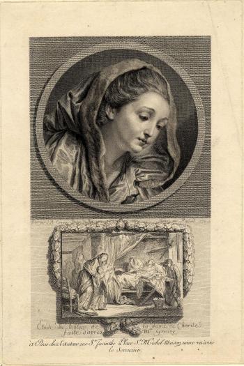 Jean Massard, after Jean Baptiste Greuze, A Woman (Madame Greuze) with a Fur-trimmed Hood Drawn over Her Head, Detail from Greuze’s ‘La Dame de Charité’ above a Sketch of the Painting, 1772, etching and engraving, 24 × 16 cm (London: British Museum, 1978,0121.291).