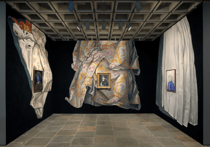 Party’s mural includes elaborate draperies that highlight the Rosalba portrait along with two additional pastel portraits he created in response to it. These ornate draperies evoke the work of two other towering figures in European pastels—Jean-Étienne Liotard (1702–1789) and Maurice-Quentin de La Tour (1704–1788)—echoing the function of Venetian Carnival masks, designed to conceal and reveal the features of their wearers. Party’s installation engages devices of disguise and disclosure, from masks to draperies to makeup (often produced with the same chemical components used to make pastel sticks).