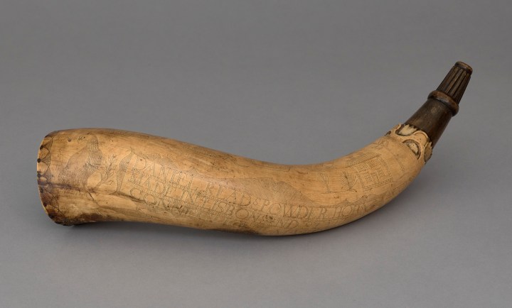 Unidentified maker, Powder Horn, 1802, Lisbon, Connecticut, cow horn, pine, and iron (Wadsworth Atheneum Museum of Art, James L. Goodwin Art Purchase Fund, 2023.22.1).