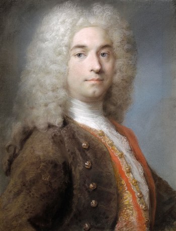 The figure depicted was first identified as the legendary art collector Pierre Crozat, and later as Louis Armand II de Bourbon, Prince de Conti; neither suggestion, however, has been verified. The sitter poses with torso in profile and his head positioned toward the viewer, nearly achieving contact while maintaining a slight aloofness. With his magnificent shoulder length wig, damask justaucorps coat, and splendid red vest embellished with gold embroidery and buttons, this handsome sitter was clearly someone of status and rank.