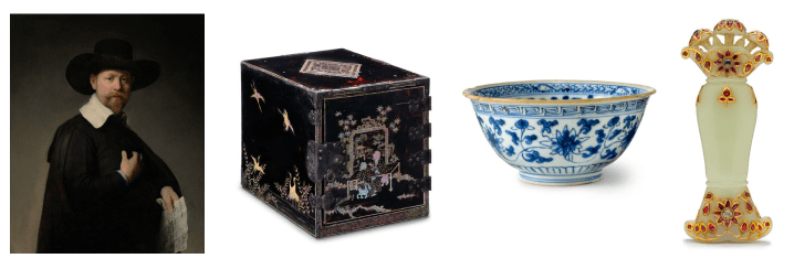 From left to right: Rembrandt Harmensz. van Rijn, Portrait of Marten Looten, 1632 (LACMA, gift of J. Paul Getty); Chest with Figures, Flowers, and Birds, Ryukyu Islands, ca. 1650–1750 (LACMA, gift of Mr. and Mrs. Leo Krashen); Bowl (Wan) with Floral Scrolls, China, Qing dynasty, Kangxi period, 1662–1722 (LACMA, gift of Ambassador and Mrs. Edward E. Masters); Dagger Hilt with Triple Lotus Bud Pommel, India, Mughal empire, ca. 1700–50 (LACMA, from the Nasli and Alice Heeramaneck Collection, Museum Associates Purchase).