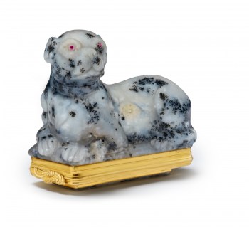 In the 18th century, Dresden’s lapidary artists incorporated the naturally occurring patterns of Saxony’s unusually rich and varied minerals into some of the most ingenious designs. For this exquisite snuffbox in the shape of a dog, the stone specimen was carefully selected for the shape and distribution of its dark inclusions that evoke the hound’s spotted fur.