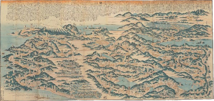 Panoramic Map of the Tōkaidō Highway, Shōtei Kinsui, drawn by Kuwagata (better known as Keisai). Published by Sanoya Ichigorō, Izumiya Hanbei, and Izumoji Manjirō, n.d. (likely 1810). Polychrome xylography, 52 x 24 inches (Los Angeles: Richard C. Rudolph Collection of Japanese Maps, Special Collections, UCLA Library).