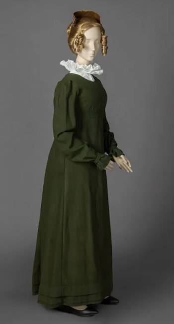 This green gown, made of wool, ca. 1815, is remarkable to have survived, because many woolen garments of the day were destroyed by moths and carpet beetles (Mary Doering Fashion Collection).