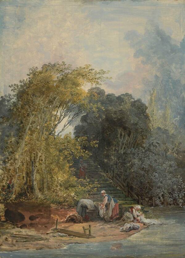 Hubert Robert, The Washerwomen of Charenton, 1767–70, oil on cradled panel, 15 × 11 inches (South Bend: Raclin Murphy Museum of Art, 2024.008.011).