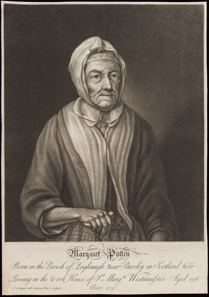 Printed likenesses also helped create celebrity among ordinary people who led extraordinary lives. One such woman was Margaret Patten (b.? –1739). Given that 50 was considered the threshold of old age, it is not surprising that Patten, who claimed to be 136 years old in 1737, attracted attention. News of her long life reached newspapers throughout the English Colonies, and people were especially interested in Patten’s secret to long life. Descriptions mention that she was “very hearty,” took long walks, and drank only milk. At the end of her life, Patten lived in a workhouse in London where she died in 1739. The mezzotint included in the exhibition is based on a portrait by John Cooper painted at the request of local officials to hang in the workhouse to commemorate Patten’s long life.