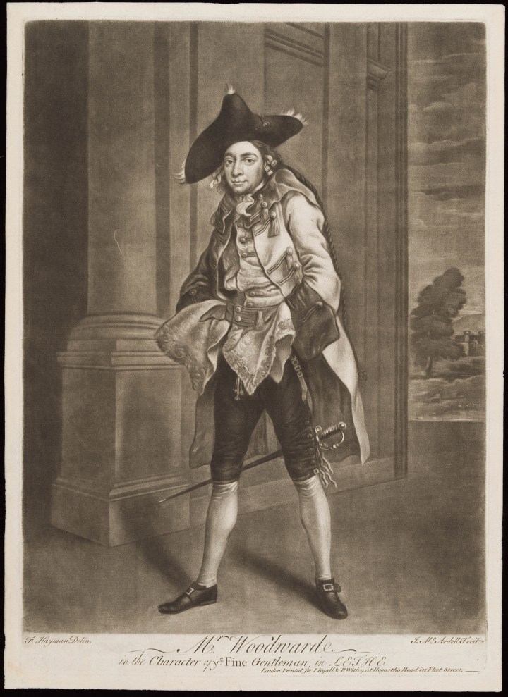 James MacArdell after Francis Hayman, Mr. Woodwarde in Character of ye Fine Gentleman in Lethe, 1740–65, mezzotint (Courtesy of the Art Museums of Colonial Williamsburg, Museum Purchase, 1973-318).