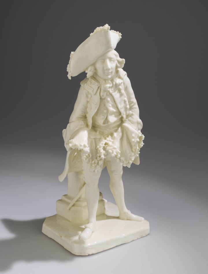 Just as today, actors were known not only for the roles they played but also as public figures in their own right. Audiences were interested in their personal lives and backgrounds as well as their performances. These actors were often depicted in prints wearing costumes or striking poses that represented their most famous roles. Portraits of actors, poets, and creative figures served as inspiration for ceramic figures, and their appearance appeared on handkerchiefs, snuffboxes, and drinking vessels. One example featured in Celebrity in Print is of the successful British actor Henry Woodward (1714–1777) who was known for his comedic performances. The soft-paste porcelain figure of Woodward, made by the Bow Porcelain Manufactory in London (1750–53), is based on a print that showed him as ‘The Fine Gentleman’, one of his most celebrated characters from David Garrick’s first play, Lethe, or Esop in Shades, first performed in London on 15 April 1740. Woodward’s character, dressed in an absurd outfit, poked fun at wealthy Englishmen who traveled through Europe on what was known as the Grand Tour. Upon their return, it was feared that they would adopt foreign dress, customs, and tastes. The play, which was popular in the Colonies, was performed in New York, Philadelphia, Annapolis, and Charleston.
