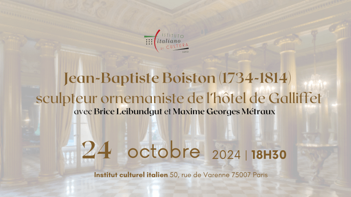 Né en 1734 à Morteau, dans le Doubs, Jean-Baptiste Boiston est un sculpteur ornemaniste de premier plan durant la seconde moitié du XVIIIe siècle. Il est principalement actif à Paris de 1760 à 1792, avant d’émigrer au moment de la Révolution. En 1814, au lendemain de la Restauration, il revient s’établir dans la capitale française où il s’éteint cette même année. Cette conférence se propose d’étudier son œuvre et d’inventorier sa production connue à ce jour. Les créations de Jean-Baptiste Boiston sont principalement à destination de nombreux hôtels particuliers parisiens, mais aussi au service du prince de Condé (Palais Bourbon, château de Chantilly). Ses différents chantiers auprès de l’architecte Étienne François Legrand feront l’objet d’une analyse détaillée, au premier rang desquels le chantier de l’hôtel de Galliffet, actuel Institut culturel italien de Paris. Cette conférence sera l’occasion de plonger dans l’univers de cet entrepreneur en ornements sous le règne de Louis XVI, de découvrir son métier et ses spécificités, mais aussi d’évoquer sa relation avec l’Italie.