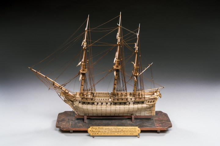 Another exquisite model of early shipbuilding is the Napoleonic War Model. Made entirely of bone by French prisoners in the British Dartmoor Prison, it was likely traded for food (prisoners were held on British prison ships during the Napoleonic wars; other similar models may have been made by American prisoners during the war of 1812). This model depicts an unidentified British frigate with 50 guns and has a decorative paper-covered wooden stand dating from about 1790 to 1820. With no provenance, it is assumed to be French and made for the British. The model, considered a folk-art masterpiece, was presented to David Bruce, Sr. by Commodore Charles Stewart, United States Navy, at Bordentown, New Jersey, in about 1820. Stewart was a Philadelphian who served in the navy for 63 years, playing key roles in the Quasi-War, Barbary Wars, and the War of 1812.
