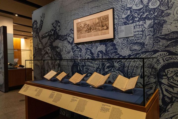 View of the exhibition The Most Formidable Weapon against Errors: The Sid Lapidus ’59 Collection and the Age of Reason, as installed at Princeton’s Firestone Library, 2025.