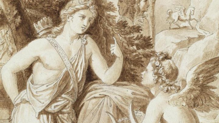 José de Madrazo y Agudo, The Dispute between Apollo and Cupid, detail, ca. 1812, pencil and grey-brown wash on wove paper, 29 × 22 cm