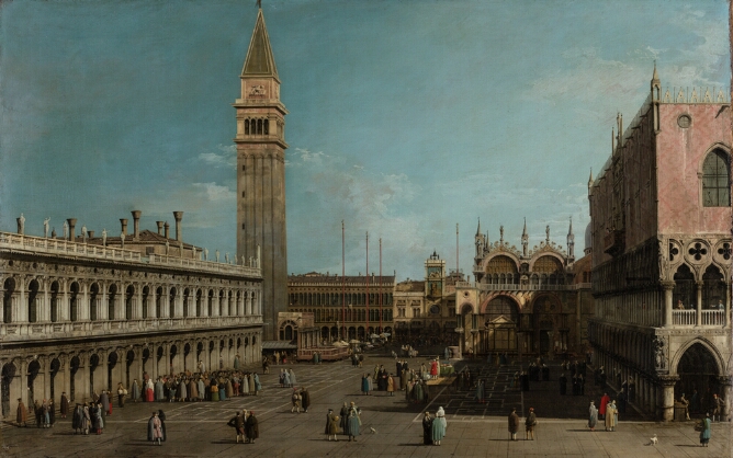 Canaletto, The Piazzetta, Venice, Looking North, ca. 1740 (Pasadena: Norton Simon Museum). The Marciana Library is visible to the left, in front of the bell tower.