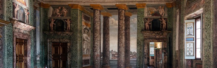 Hall of Perspectives, Villa Farnesina, frescoes painted by Baldassare Peruzzi, ca. 1510–16. Built for Agostino Chigi, the villa was acquired by the Farnese family in 1577.