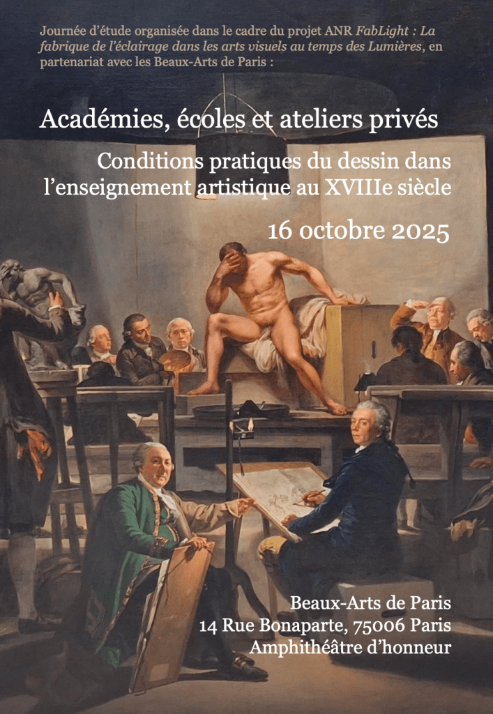 Dans le cadre de l’ANR FabLight, et en partenariat avec l’École des Beaux-Arts de Paris, Marlen Schneider (Université Grenoble Alpes/LARHRA) organise une journée d’étude intitulée Académies, écoles et ateliers privés : Conditions pratiques du dessin dans l’enseignement artistique au XVIIIe siècle.