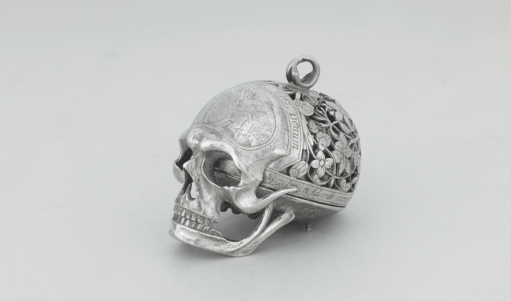 Jean Rousseau, Skull-shaped Watch, Geneva, mid-17th century, silver and gilt brass (Paris: Musée du Louvre). The engraved decoration depicts Adam and Eve and the Resurrection of Christ, with text from St. Paul.