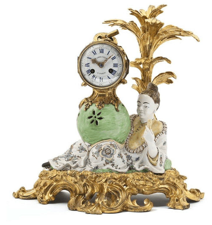 Porcelain clock, Ladouceur (clockmaker), Manufacture de Chantilly, ca. 1740–50, soft-paste porcelain, polychrome decoration, over glaze, chased and gilded bronze (Paris: Musée des Arts Décoratifs, 22757).