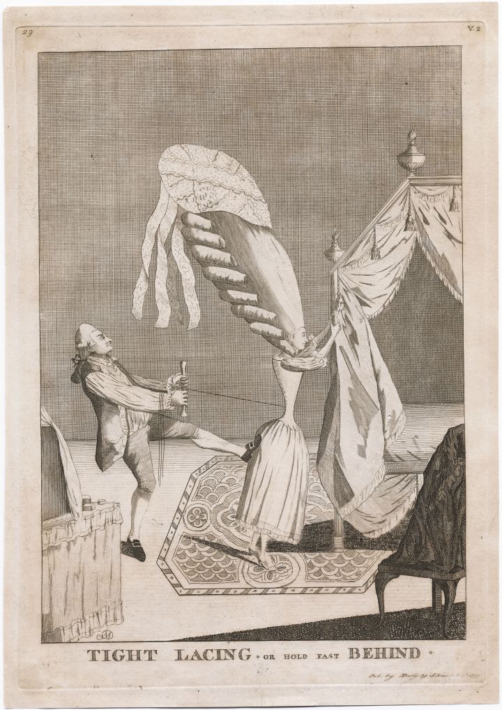 Anonymous artist, published by Matthew and Mary Darly, Tight Lacing, or, Hold Fast Behind, 1 March 1777, etching and engraving, 351 × 247 mm (Farmington, CT: Lewis Walpole Library, Yale University).