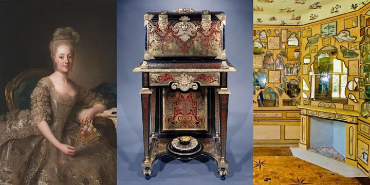 Left: Alexander Roslin, Portrait of Hedvig Elisabet Charlotta, Princess of Sweden, detail, 1775 (Nationalmuseum, Sweden). Center: André-Charles Boulle, Coffer-on-stand (Chatsworth House Trust). Right: Mirror shard cabinet, Apartment of Margravine Wilhelmine of Bayreuth, ca. 1750 (Old Palace of the Hermitage in Bayreuth; photo by Achim Bunz).