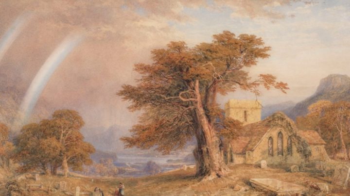 Fanny Blake, A Rainbow over Patterdale Churchyard, Cumbria, 1849, watercolour and opaque watercolour over graphite, with scratching out, on wove paper (Jointly owned by the Samuel Courtauld Trust and The Wordsworth Trust, Gift from a private collection in memory of W. W. Spooner, 2025).