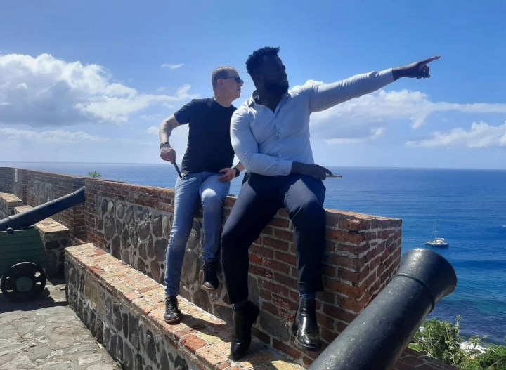 Exhibition curator Josh Perelman (left) with Heritage Inspector Raimie Richardson (right) on St. Eustatius (known locally as ‘Statia’) (Photo by Avida Linvy, November 2025).