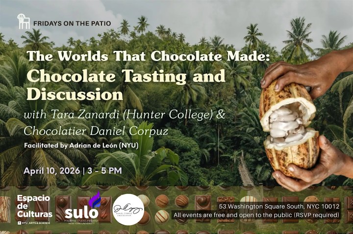 This event is in collaboration with SULO: The Philippine Studies Initiative at NYU, and includes a guided chocolate tasting, where you will be able to try chocolate crafted by Daniel Corpuz, a Filipino chocolatier based in New York City. The event will also feature a conversation with Tara Zanardi, a professor at Hunter College, who will explore the history and geopolitics of chocolate as they relate to the Americas and Philippines. The conversation will be facilitated by Adrian de León. Join us to appreciate the flavors of chocolate while also gaining insight into the systems that shape its production and accessibility—discovering the worlds that chocolate created.