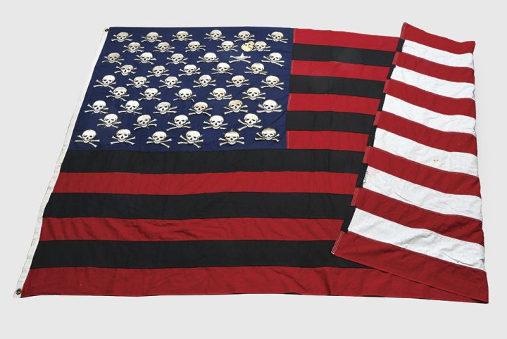 In 1901, Mark Twain published a satirical essay in the North American Review titled “To the Person Sitting in Darkness,” which attacked American violence and imperialism in the Philippines. He concluded it by suggesting a new American flag, “with the white stripes painted black and the stars replaced by the skull and crossbones.” A Ramparts article by Twain critic Maxwell Geismar suggested that, had Twain been listened to, “the new century might have been spared 50 years… of what is essentially a race war under the guise of such ambiguous and shifting concepts of nationalism and capitalism” (p. 65). Peter Harrington Rare Books is offering an original flag produced in late 1960s San Francisco to protest American state-sanctioned violence, especially the war in Vietnam. It was probably created by staff of the left-wing magazine Ramparts, who used it as the cover image for their May 1968 issue (£2,750).
