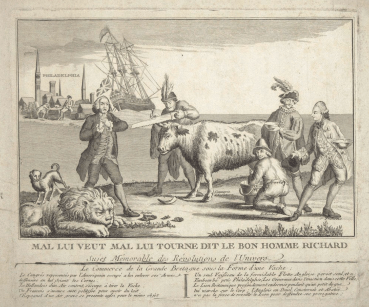 Mal Lui Veut mal Lui Tourne dit le Bon Homme Richard. Sujet Mémorable des Révolutions de l’Univers. Le Commerce de la Grande Bretagne sous la forme d’une Vache, engraving 225 × 265mm. A cow representing Britain’s commerce is having its horns cut off by an American, as a Dutchman milks it and a Spaniard and Frenchman wait with bowls. An Englishman wrings his hands. A British lion lies asleep as a pug urinates on it. In the background brothers Admiral Richard Howe and General William Howe sit at a table at Philadelphia, with Admiral Howe’s flagship Eagle in dry dock, the two bogged down in the occupation of the city (abandoned after 266 days on June 18th 1788). A reverse copy of a satire published in the Westminster Magazine, 1 March 1788 (BM 5472). See BM Satires 5727. Offered by Grosvenor Prints, £950.