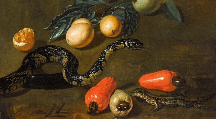 Dirk Valkenburg, Study of Cashews, Maracujas, a Tropical Chicken Snake, and an Ameiva Lizard from Suriname, detail, 1706–08, oil on canvas, 40 × 48 cm (Musée des Beaux-Arts de Quimper).