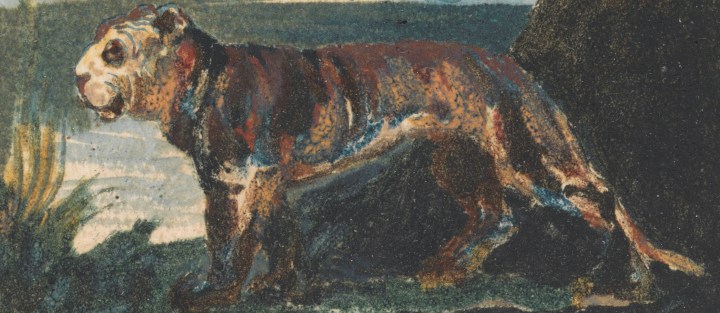 William Blake, The Tyger (Plate 42, from Songs of Innocence and of Experience), detail, 1794, color-printed relief etching with hand coloring in watercolor (New Haven: Yale Center for British Art, Paul Mellon Collection).