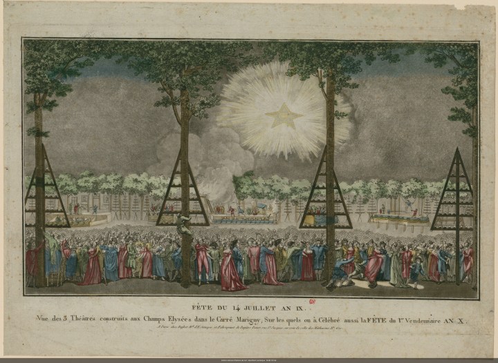 Paul-André Basset, Fête du 14 Juillet An IX, ca. 1801, hand-colored engraving, 28 × 44 cm (Paris: Bibliothèque de l’Institut National d’Histoire de l’Art). The print depicts the national holiday, as celebrated on the Champs-Élysées and organized by Chalgrin, commemorating the storming of the Bastille in 1789.
