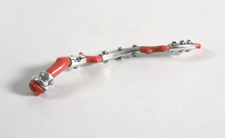 Among the items are several that adorn Torah scrolls, the holiest text of Judaism. These objects reflect both Jewish practice as well as the artistic styles of their places of production. The oldest of the works on view include a silver Torah shield from the 1660s, one of the earliest surviving pieces of Jewish ceremonial art from Nuremburg, Germany. This specific shield is decorated with unicorns, lions, and foliage, echoing styles popular in German art across religious communities in the period. The exhibition also includes three sets of Torah finials (ornamental metal objects placed atop the wooden rollers of a Torah scroll) featuring small bells to announce the movement of the holy text during congregational processions. These three sets of Torah finials come from distinct Jewish communities—one was crafted in London by the noted silversmith Solomon Hougham in the 1700s, another made in Iran a century later, and the third made in Morocco in the early 1900s—and reflect how Jewish communities across the world ornament the Torah in different ways. The exhibition also includes two silver Torah crowns used to beautify the Torah scroll: one from the late 1700s made in Ferrara, Italy, an important center of Jewish life since the 1100s; and the other made in North Africa in 1898–99.