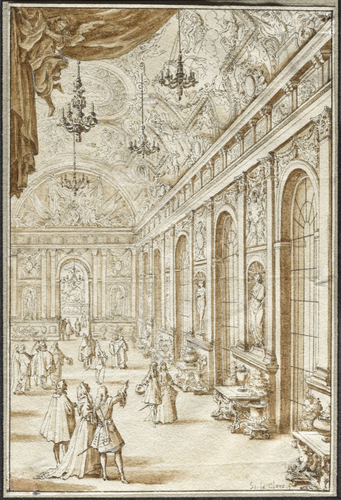 Anonymous artist after Sébastien Leclerc, View of the Hall of Mirrors, ca. 1684, pen and brown ink, brown wash on paper, 13.6 × 9.1 cm (Musée National des Châteaux du Versailles, INV.DESS 1247).