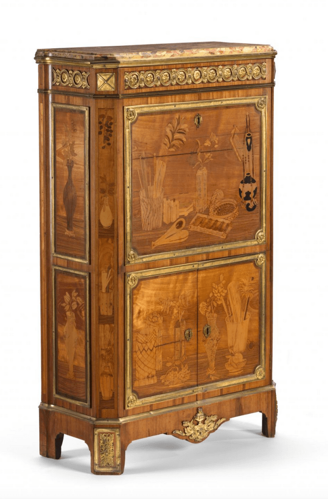 A satinwood and marquetry secrétaire à abattant with gilt-bronze ormolu mounts, ca. 1775, France; stamped: René Dubois (maître, 1754–99), 137 × 84 cm (Melbourne: National Gallery of Victoria, 705.a-i-D4).